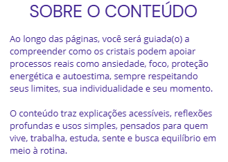 Ao longo das páginas, você será guiada(o) a compreender como os cristais podem apoiar processos reais como ansiedade, foco, proteção energética e autoestima, sempre respeitando seus limites, sua individualidade e seu momento.